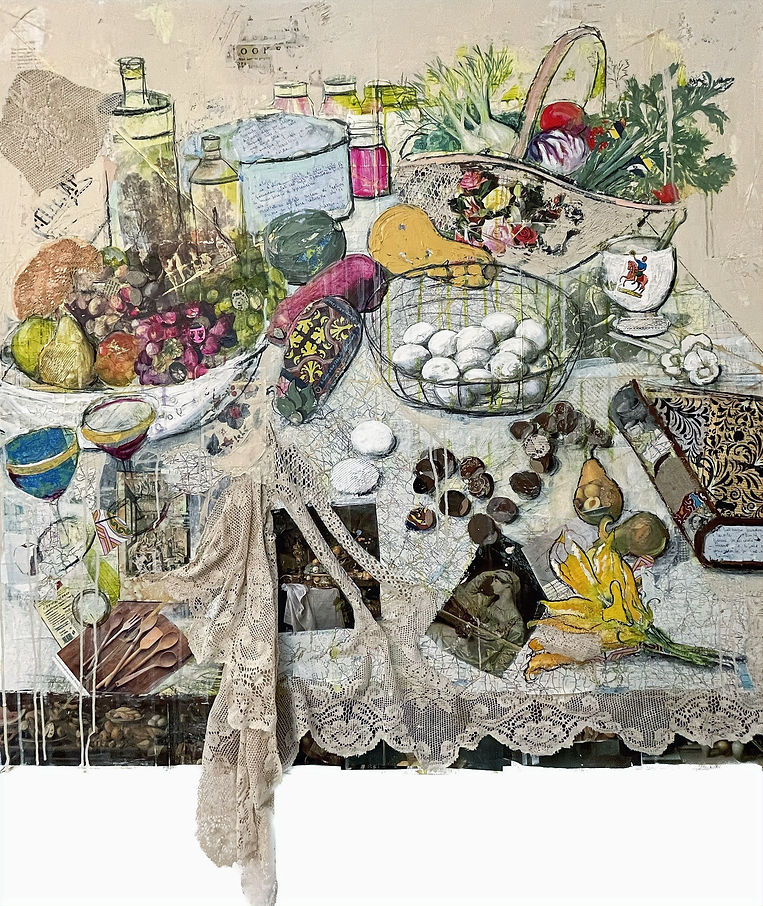 Sandra Iafrate is a multidisciplinary artist whose practice examines memory, and material as vessels of lived experience. Working primarily in painting and mixed media, she integrates traditional techniques with layered surfaces, incorporating found and vintage materials. Her accumulative processes explore temporality and identity through portraits, landscapes, still lifes, and immersive installations she calls "real life still-lifes" of imagined histories and cultural narratives. Through layering and building these imagined memories, Iafrate brings complex and intrigue in the common person, place or thing.